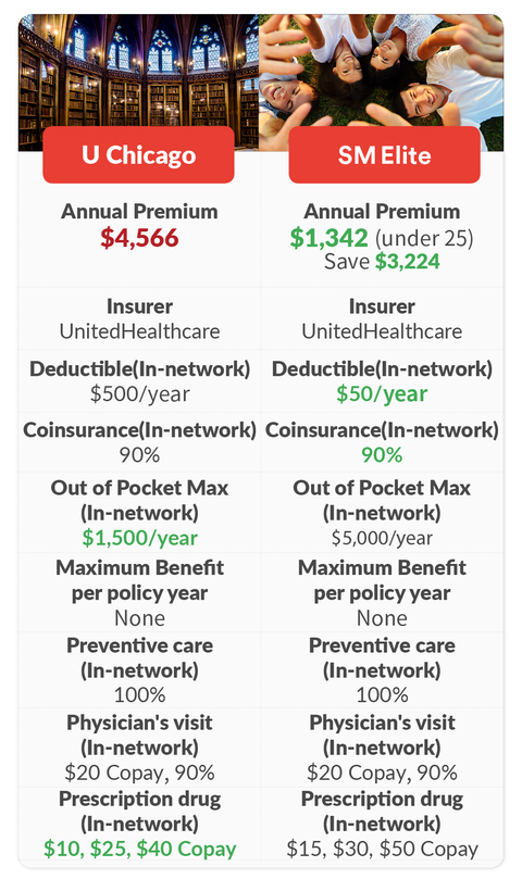 Here is a brief comparison between U Chicago’s Student Health Insurance and Student Medicover: