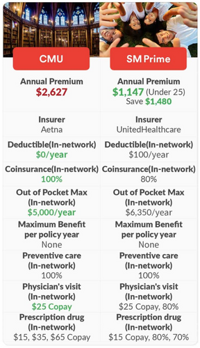 Here is a brief comparison between CMU’s Student Health Insurance and Student Medicover: